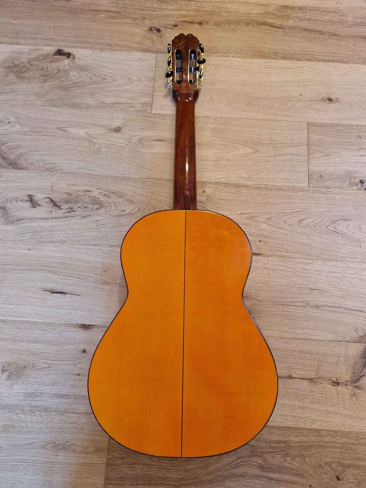 Guitaren har levet hårdt, men er netop blevet genoplivet i værkstedet. Den har fået limet en bracing på plads, laksskaderne er forsejlet og den har fået nye stemmeskruer. Nu spiller den skønt, venligt og varmt. Sadel-bredden er 52 mm, intonationen er fin og den er sat op med friske nylonstrenge.