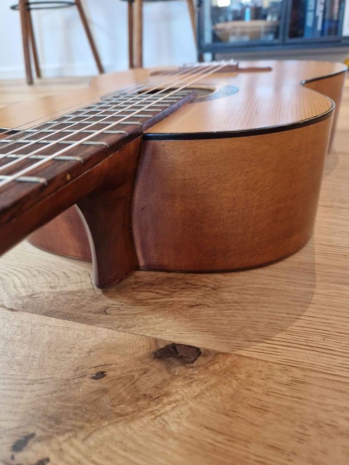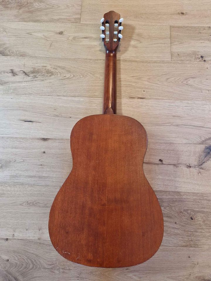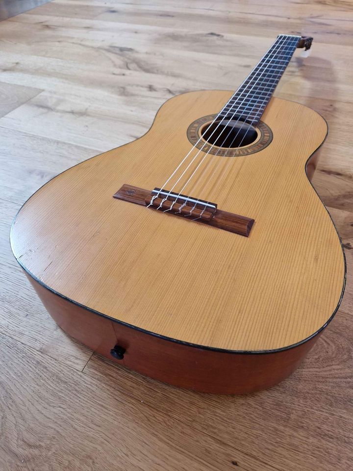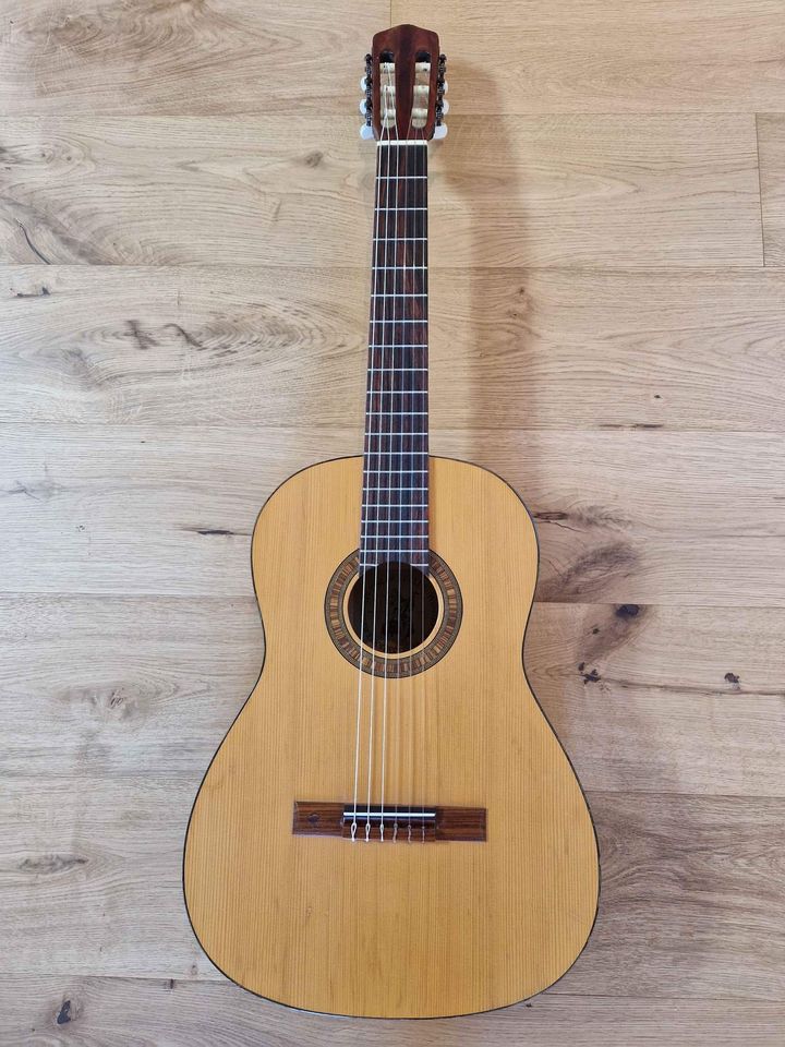 Guitaren har netop fået justeret strengehøjden(3-3.5 mm i 12. bånd), limet, renset og olieret gribebrættet, poleret bånd, samt sat op med nye Hannabach nylonstrenge. Guitaren er fuld størrelse med en sadelbredde på 52 mm.