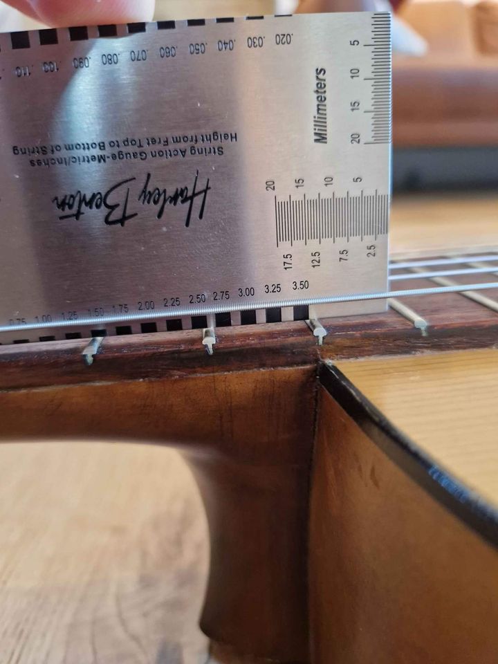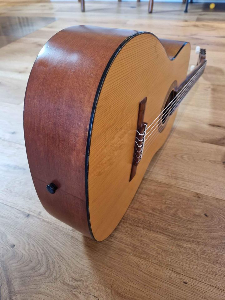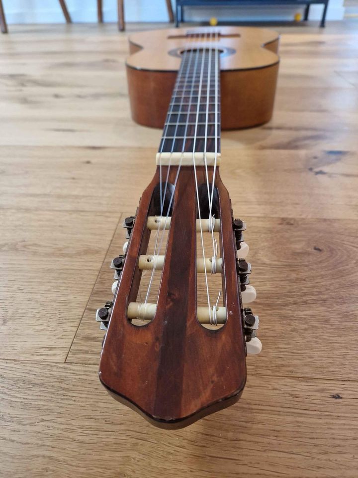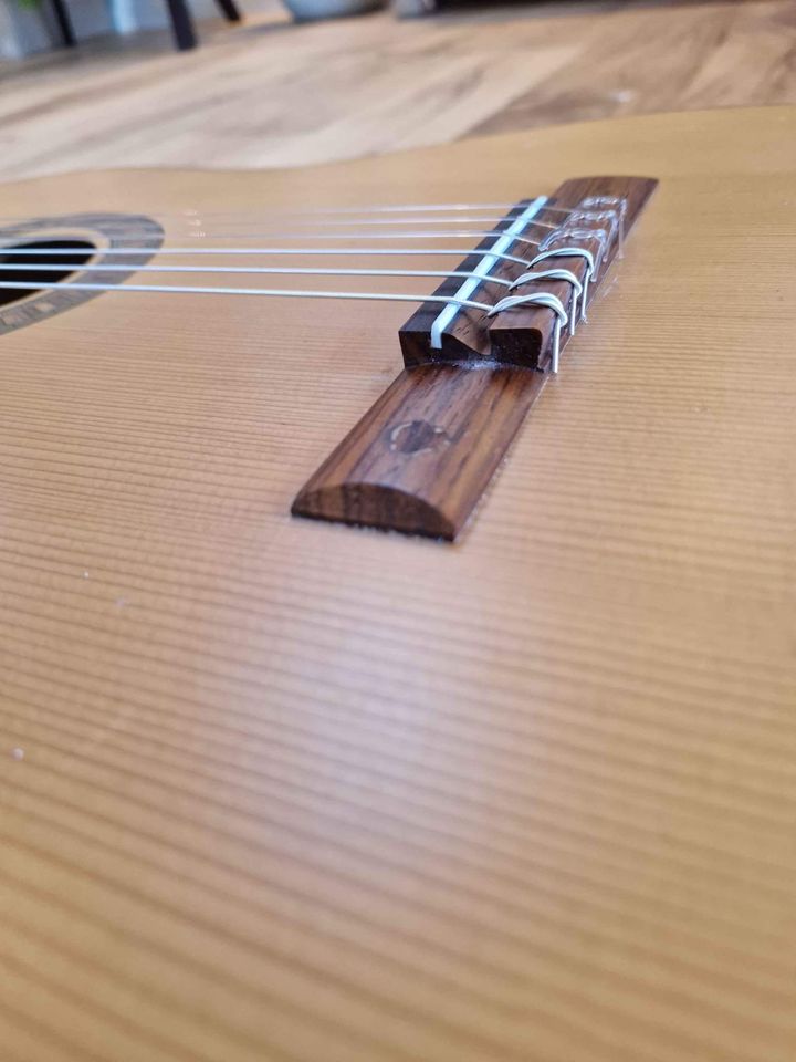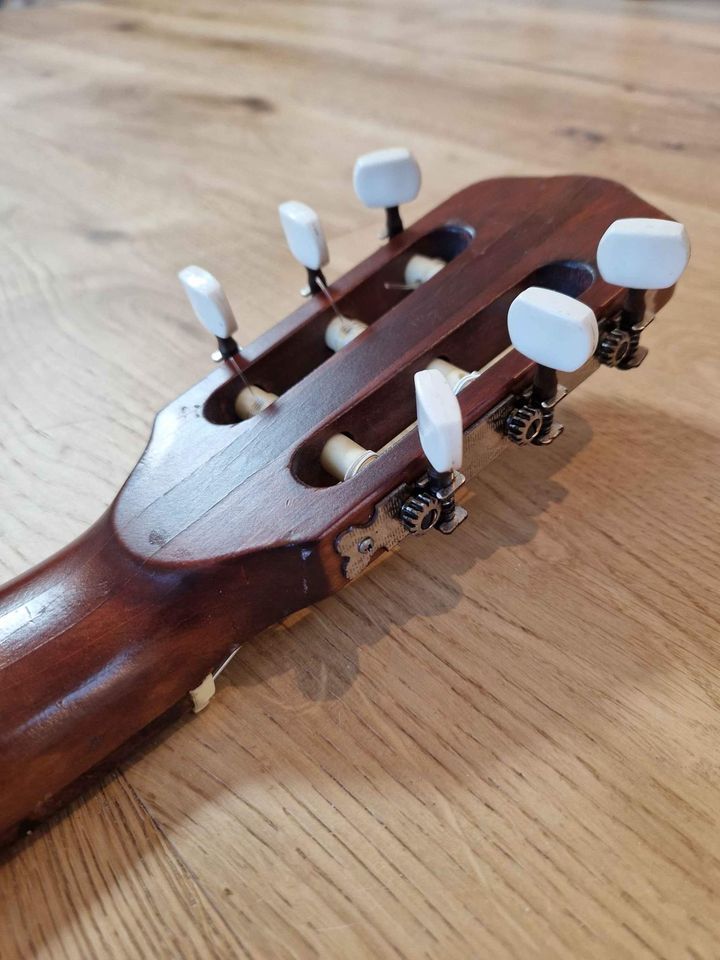 Guitaren har netop fået justeret strengehøjden(3-3.5 mm i 12. bånd), limet, renset og olieret gribebrættet, poleret bånd, samt sat op med nye Hannabach nylonstrenge. Guitaren er fuld størrelse med en sadelbredde på 52 mm.
